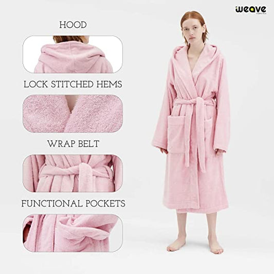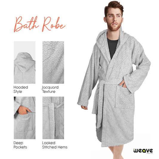 Jacquard Terry Bathrobe - 100% Cotton Dressing Gown for Men & Women, Highly Absorbent Soft Toweling Bath Robe, Hooded Dressing Bath Robe With 2 Pockets & Wrap Belt